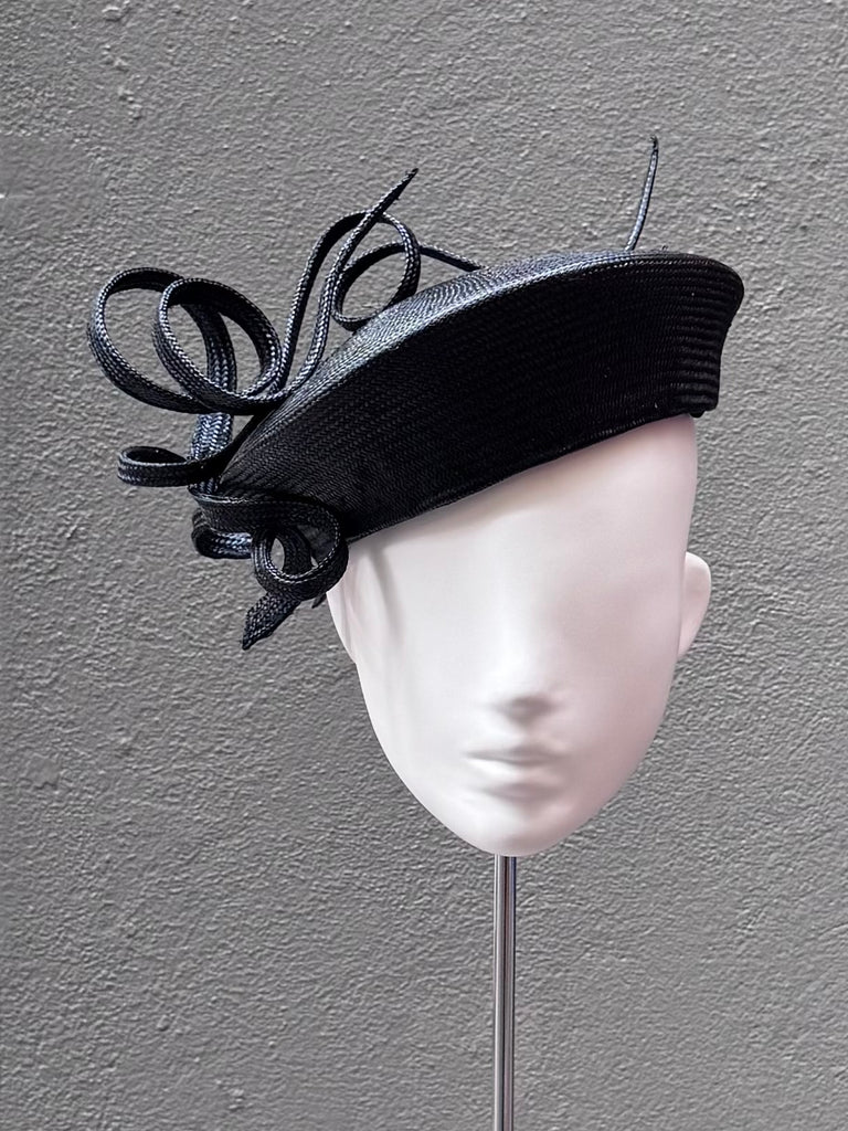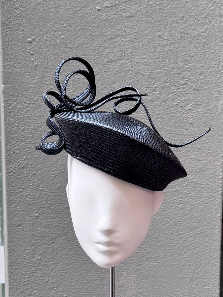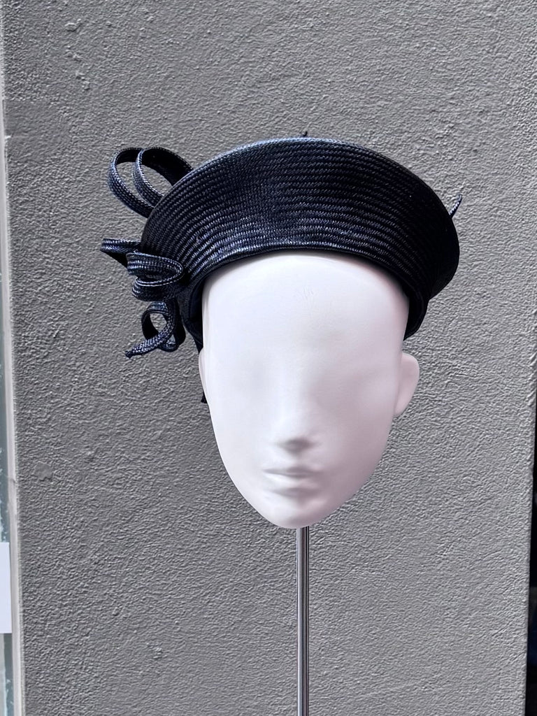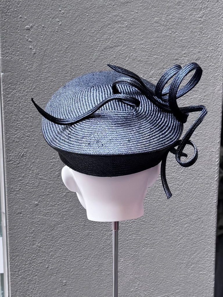 A bold reimagining of the classic sailor style, this sculpted french navy headpiece strikes a perfect balance between structure and play. The angled crown sweeps elegantly across the brow, while loops of wired straw curl upward in joyous movement, catching the light with every turn. Modern yet timeless, it's a statement piece designed for those who dare to wear colour with confidence